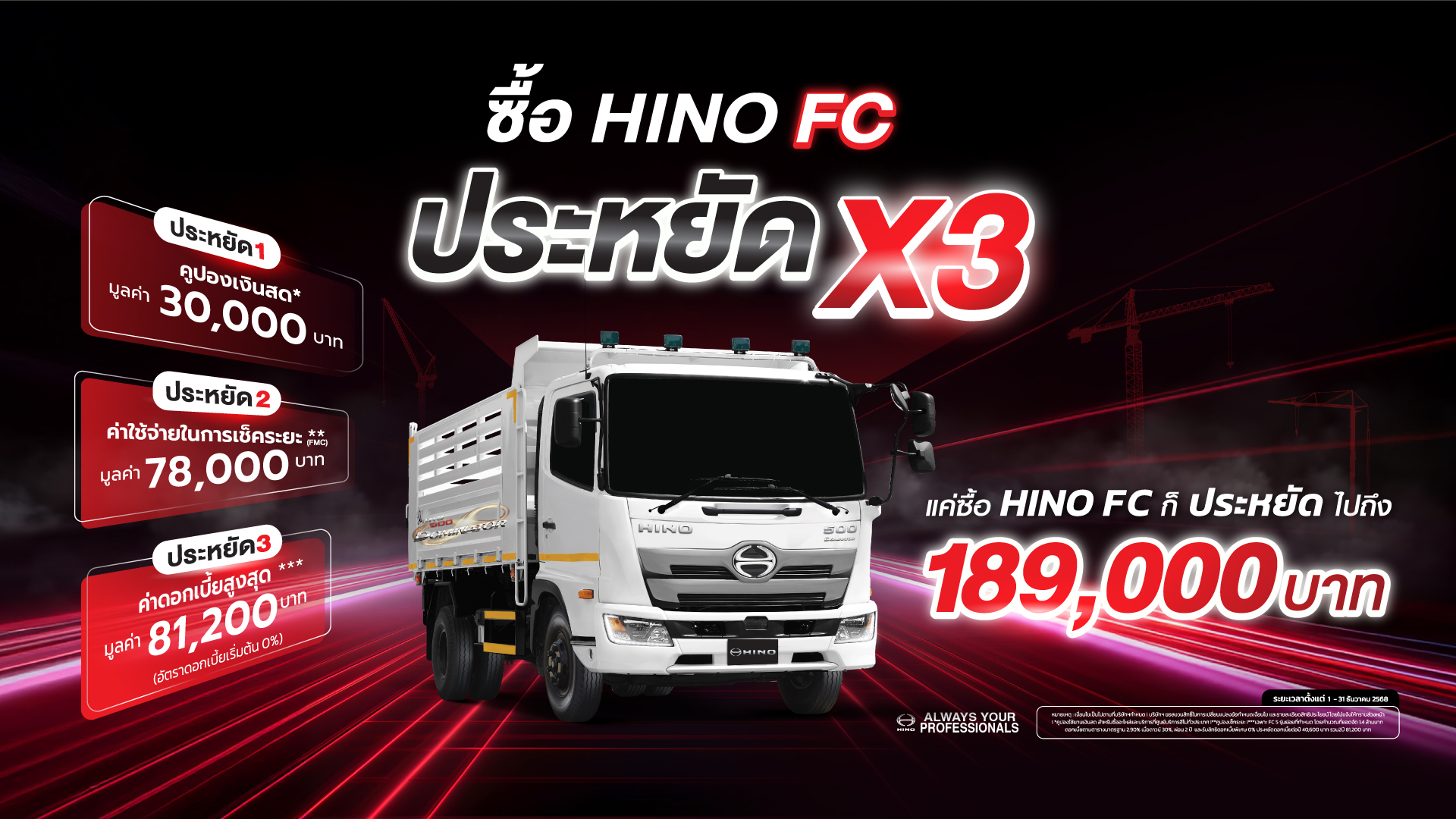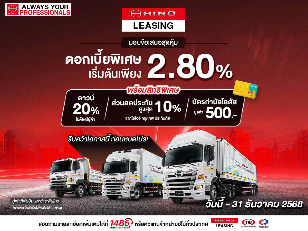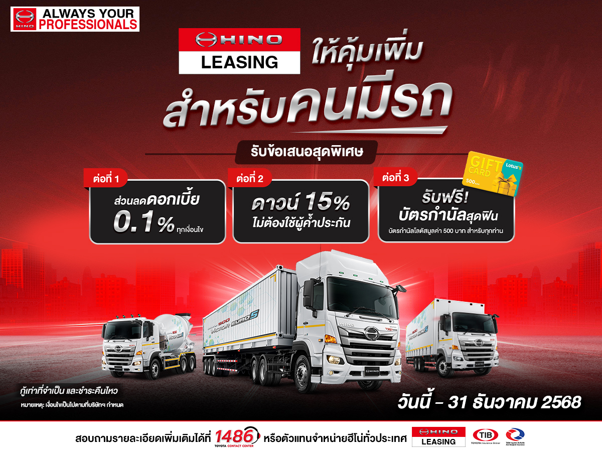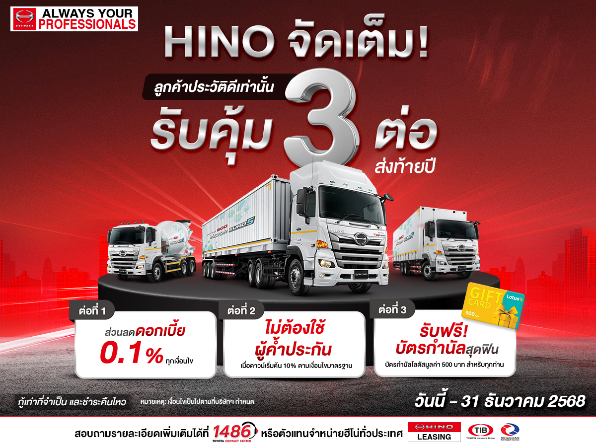 HINO จัดเต็ม สำหรับลูกค้าเก่าประวัติดีคุ้มที 3 ต่อ รับส่วนลดดอกเบี้ย 0.1%, ดาวน์ 10% ไม่ต้องมีผู้ค้ำ และบัตรกำนัลโลตัสฟรี!